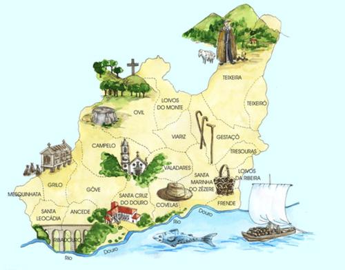Os rios - Ovil e Teixeira - que confluem no Douro, emprestam á sua beleza natural um ar de frescura e de apoio junto dos agricultores que teimam em manter verdejantes os campos, outrora de milho e de linho, hoje quase todos transformados em vinha e floresta dominante donde sai o fabuloso vinho verde que “caindo do alto da enfusa verde...”, acompanhado pelo apetecível arroz do forno com anho traz à mesa o convívio e a alegria próprias dos dias de festa… onde o estrelejar dos foguetes anunciam as romarias tão tradicionais por terras de Baião.